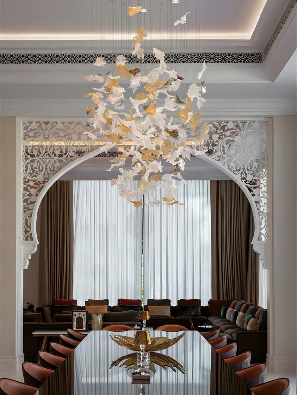 Chiếc đèn chùm lá sừng kính không tiêu chuẩn này là điểm nổi bật của dự án trang trí nghệ thuật trong phòng tiệc của khách sạn.Thiết kế độc đáo của nó làm nổi bật các đặc điểm của cá nhân hóa tùy chỉnh và kính lá cây phong cách dây chuyềnĐây là một chiếc đèn tích hợp tùy biến cá nhân, thủ công tinh tế và trang trí nghệ thuật, mang lại niềm vui trực quan độc đáo và tạo ra bầu không khí cho hội trường tiệc của khách sạn.