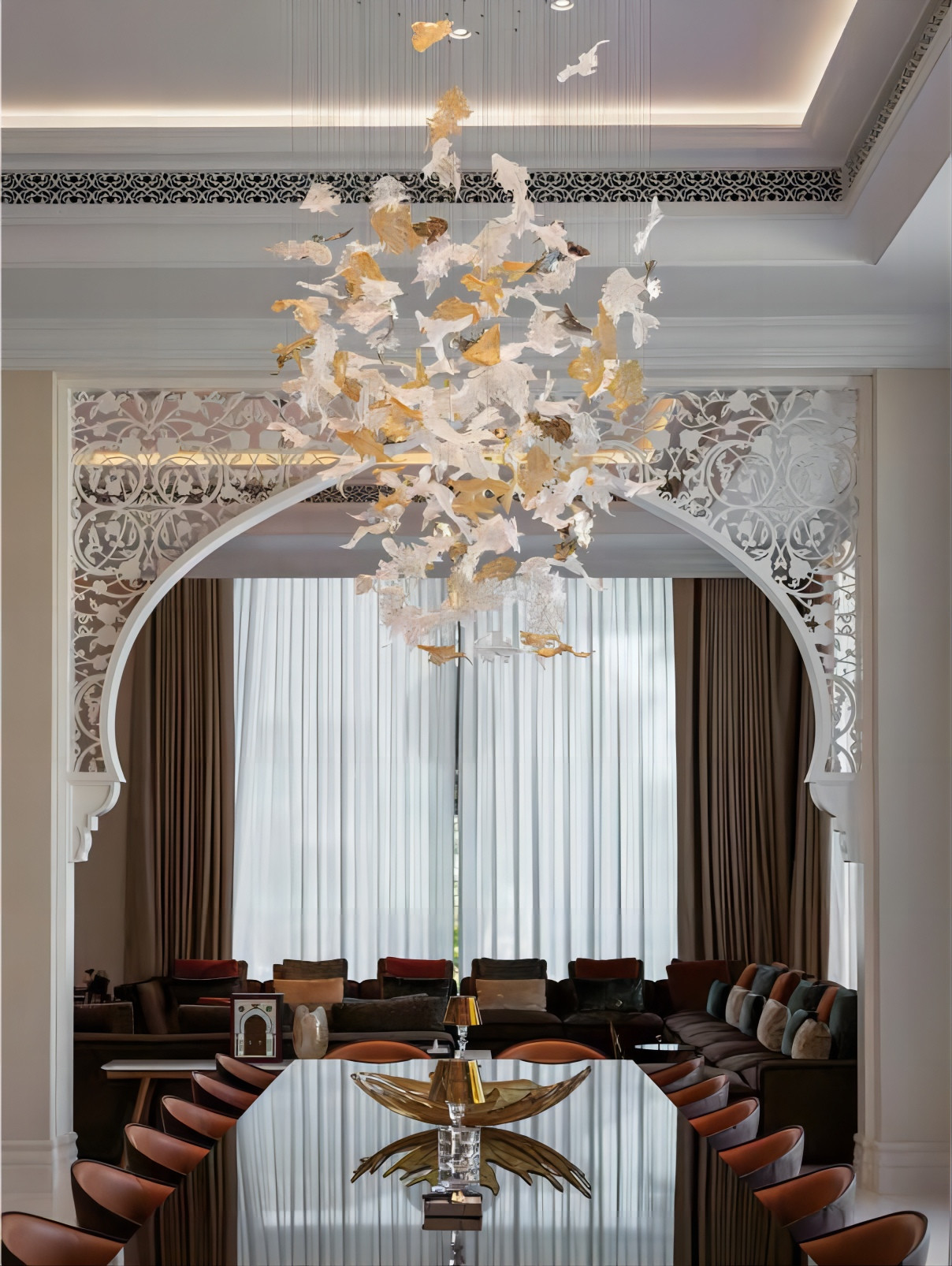Chiếc đèn chùm lá cây này được lấy cảm hứng từ lá cây và kết hợp sự thanh lịch của lá cây với ánh sáng để tạo ra một chiếc đèn rất nghệ thuật và trang trí.Mỗi chiếc dây chuyền lá phong được làm bằng kính thủ công tinh tế, cho thấy kết cấu và đường viền của lá cây phong, giống như cuộc sống. hình dạng tổng thể của đèn chùm dây chuyền lá cây phong là thanh lịch và độc đáo.hoàn toàn tích hợp vào chủ đề trang trí của phòng tiệc.